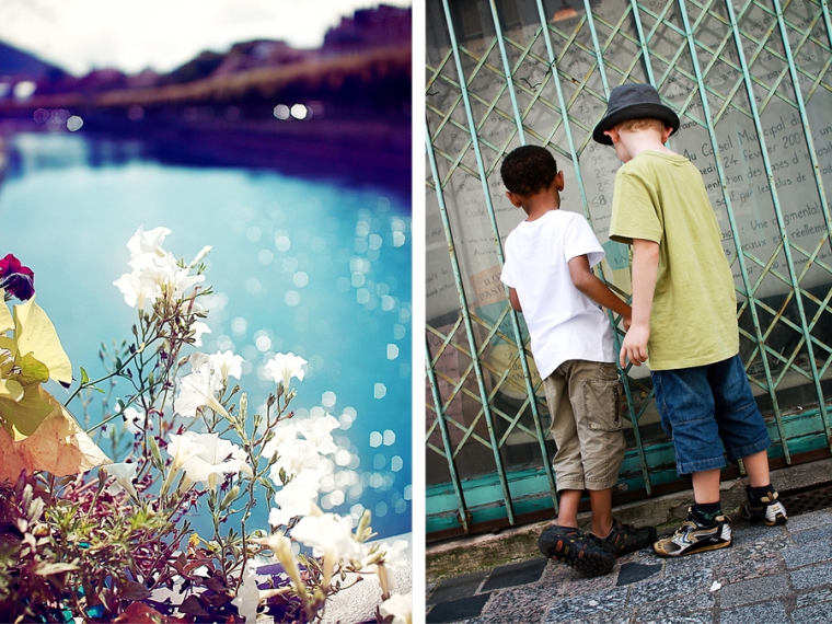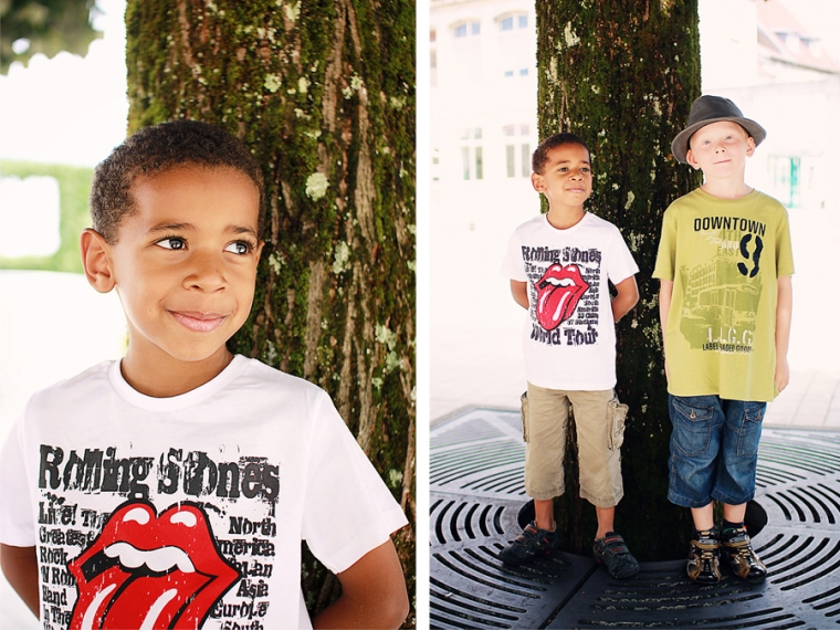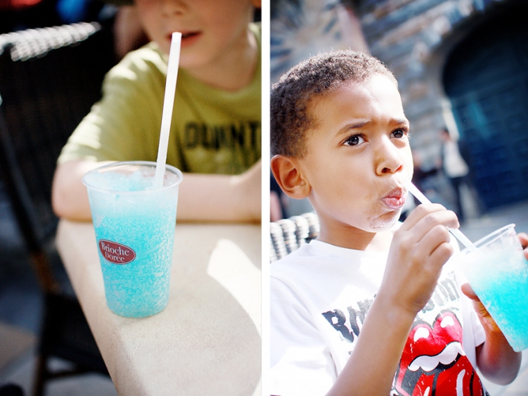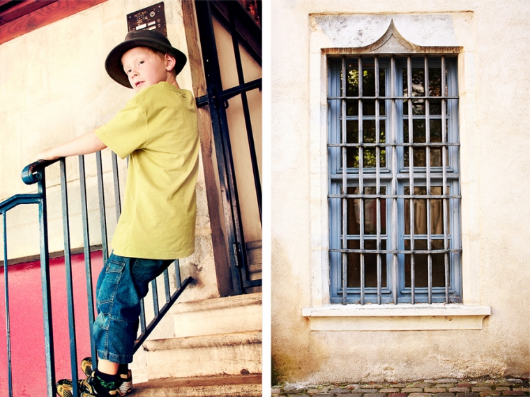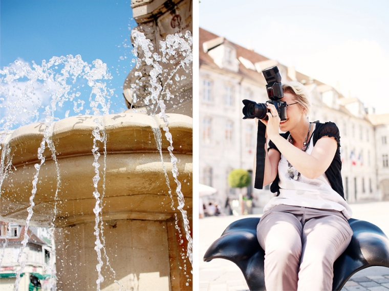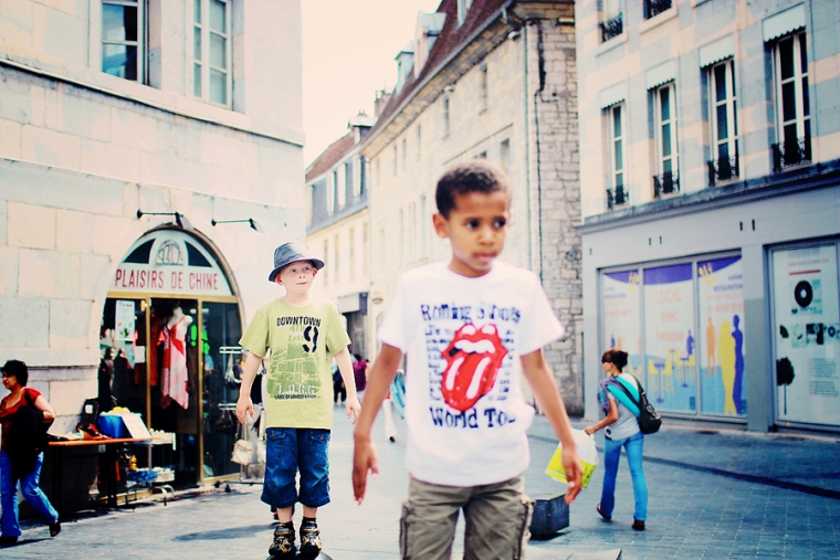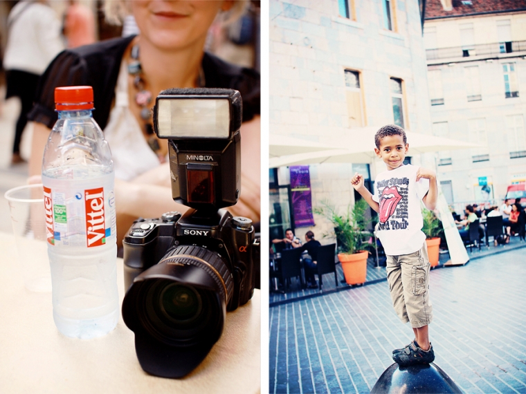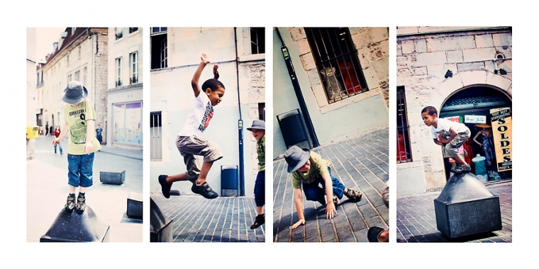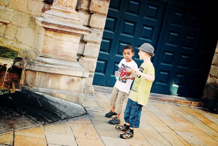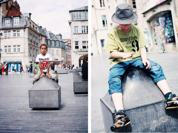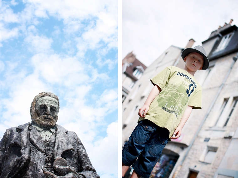 Nous étions à l’affût de la moindre porte ou arrière-cour pour shooter. Nous avons donc principalement mitraillé les garçons et un peu aussi le reste comme la statue de Victor Hugo, les toits de Besançon, la fontaine de la Place de la Révolution ! Cela ne nous ressemble pourtant pas d’avoir le pouce scotché sur le déclencheur :)… Ensuite, goûter à la Brioche Dorée avec un Nathan buvant un beuvrage digne de la fabrication d’un schtroumpf !