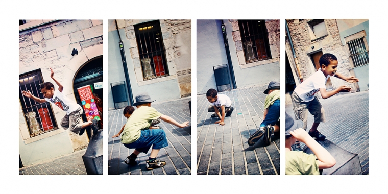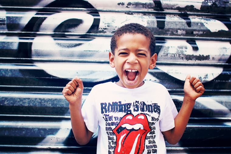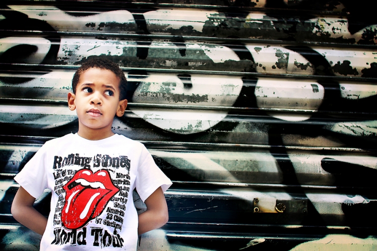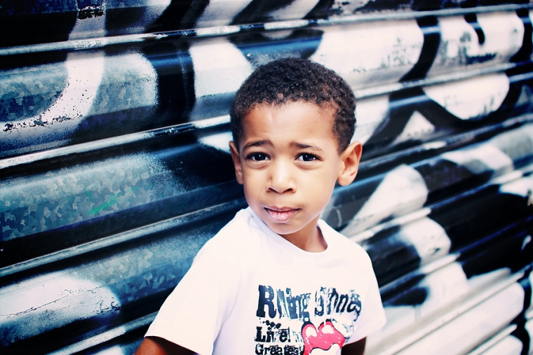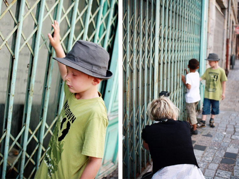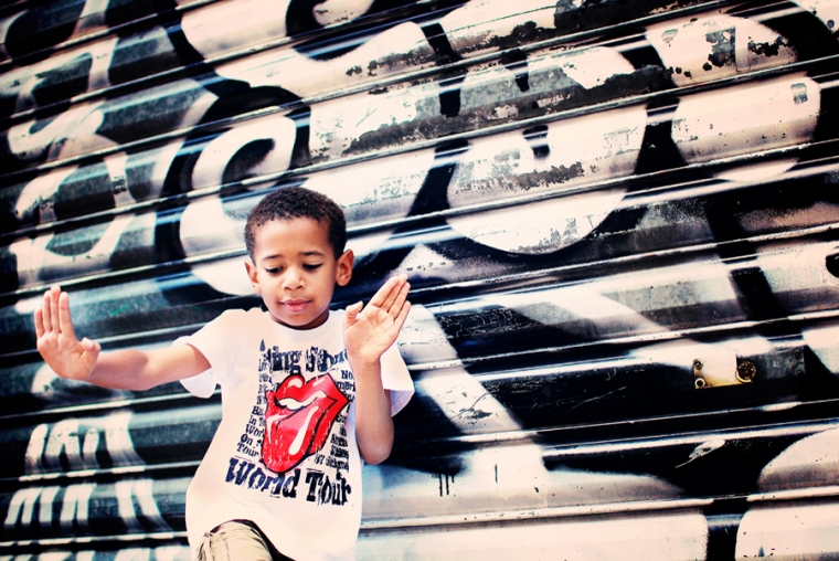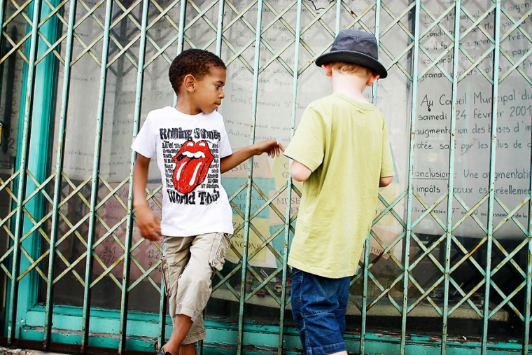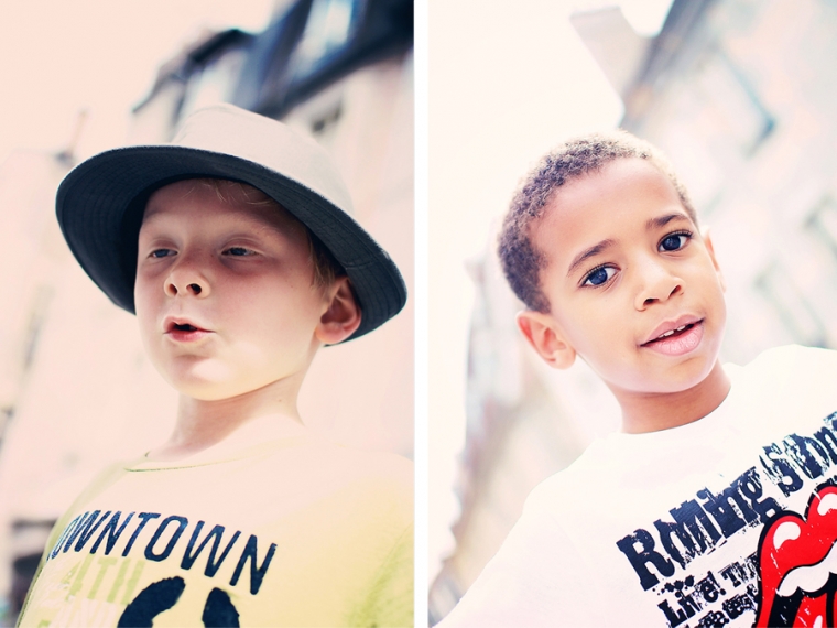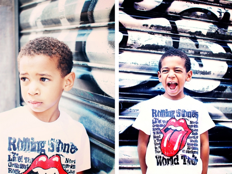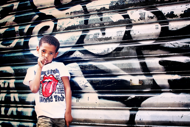 Chouette, une porte taggée mais squattée par 2 ou 3 ados. Tant pis, on investit le lieu quand même… On ne vas pas se laisser impressionner par une bande de grunge boutonneux pré-pubères ! Nathan contrairement à Emilien prend la pose facilement et sait se la jouer gangsta-style ! La question des ados qui nous regardaient shooter nos gamins : “C’est pour un magazine ?” Euh ben non !